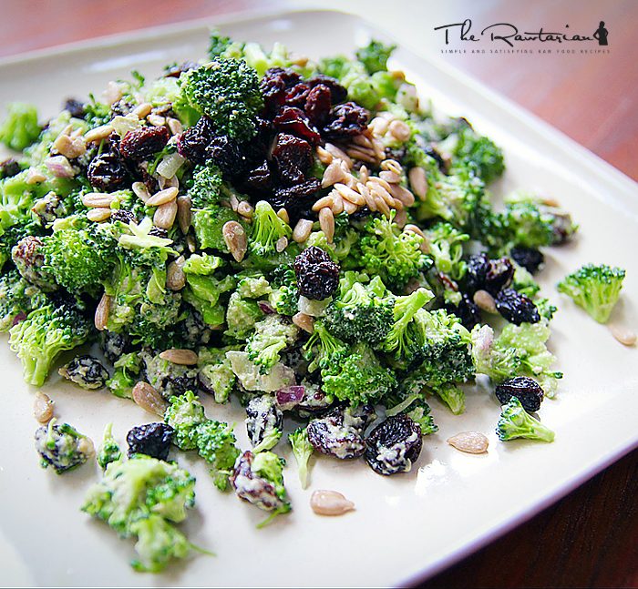 3. Add finely chopped broccoli, red onion, and ½ cup of raisins with the remaining ¼ cup of sunflower seeds in a bowl. Mix it well with the sunflower seeds dressing. This recipe should last one week in the fridge.