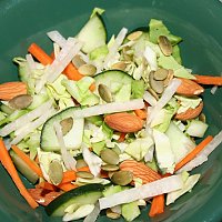 By starjen42 I’m new to raw, so I threw together this salad one day with some stuff I had on hand from the farmer’s market. What resulted was a seriously delicious and tangy salad, which I ate all on my own as my dinner. However, this also would make a great side salad split into two. I hope you enjoy it as much as I did!