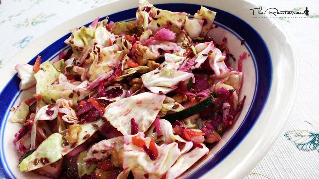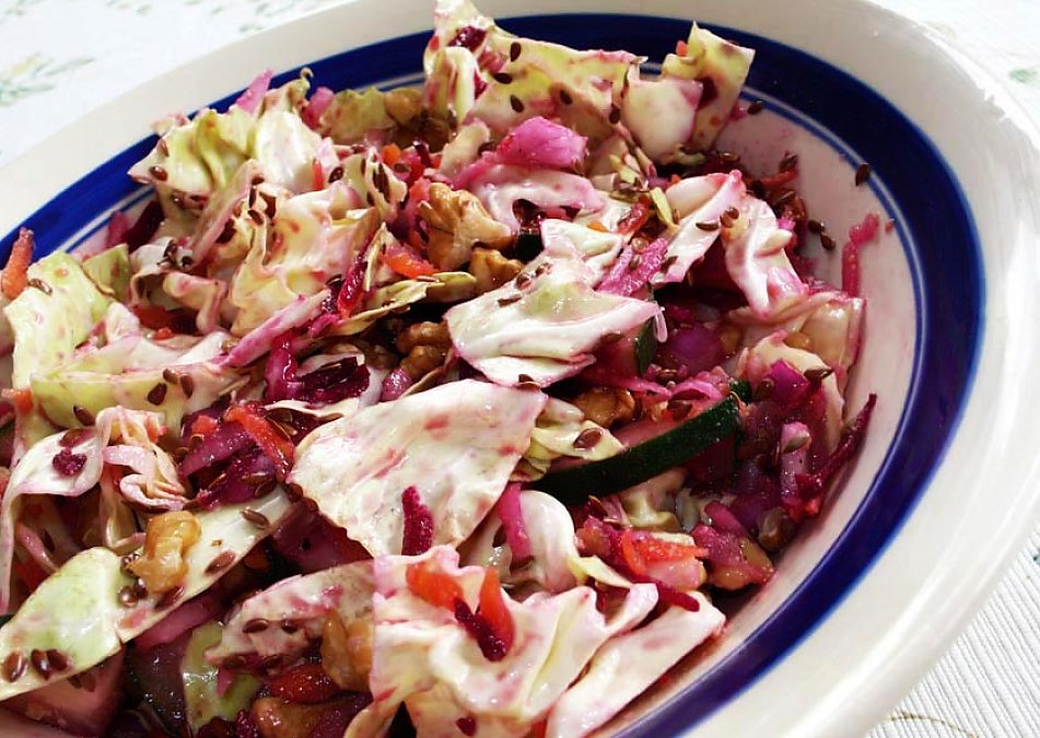 Shred cabbage coarsely with a knife. Shred carrot, beet, and radish with a cheese grater. Slice cucumber, then cut slices in quarters. Throw all veggies together in a big bowl, but no need to mix just yet. Add oil, vinegar, and avocado into a cup or small bowl. Add extra vinegar for a tangier salad. Smash avocado with a fork until a thick dressing results. Then add salt and pepper to taste, onion and garlic, then give it all a stir. Pour dressing on salad and mix very well, using your hands works best to get it all incorporated. Lastly, sprinkle on some walnut bits and flax seeds, and enjoy! Hope you like it!