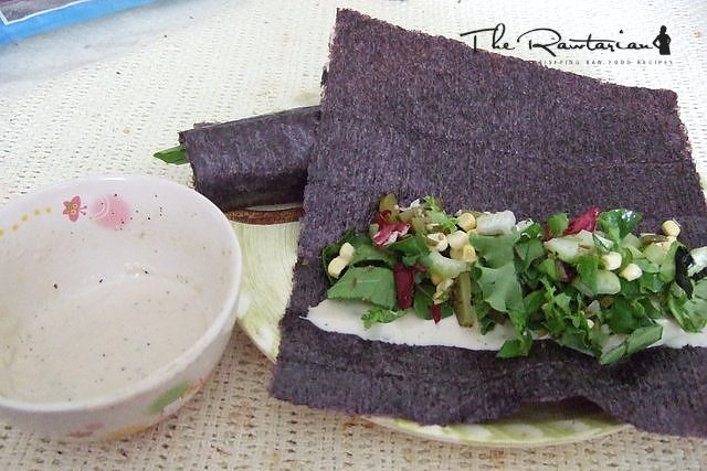 either: 4. Take a sheet of nori, and spread some dressing on it (generously!) with a spoon. Pile on some of your chopped salad, roll up, and eat! Dip in the leftover dressing.