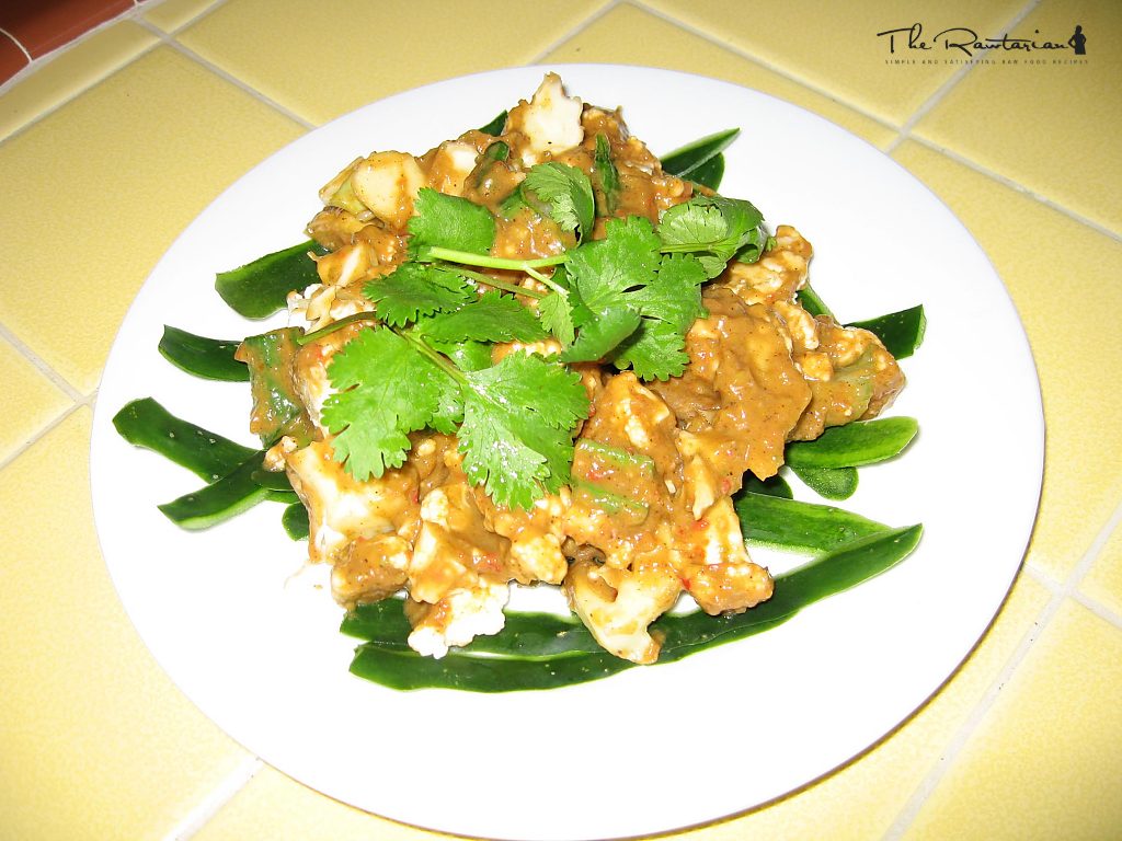 Save the chives from the green onions and cut into bite size pieces. Chop cauliflower into bite sizes pieces. Set chopped ingredients aside. In food processor blend onion bulbs, avacado, tomatoe, Bragg’s, date, water, garam masala, and cherry pepper until smooth. Add sauce to chopped ingredients so they are evenly coated. Garnish with cilantro.