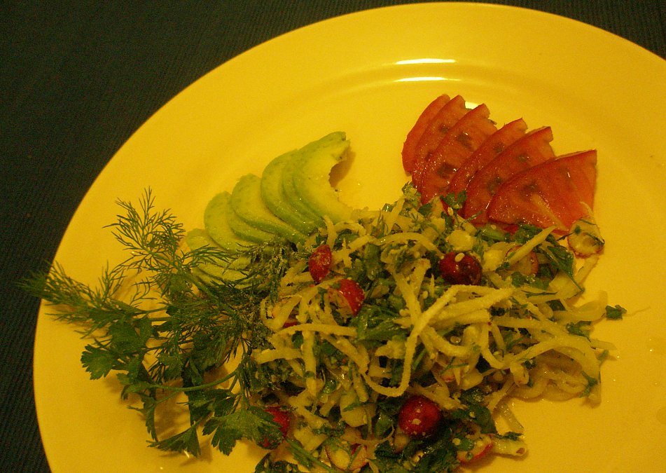 This salad stays fresh for an amazingly long time. It seems to have something to do with the keeping power of the root vegetables. By grating and dispersing them throughout the salad, their energy seems to be transferred to the more perishable ingredients. A festive and unusual tasting dish, good for a crowd. Once...