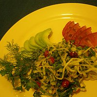 2. Chop dill and onion. Mix rest ingredients. Combine all together.