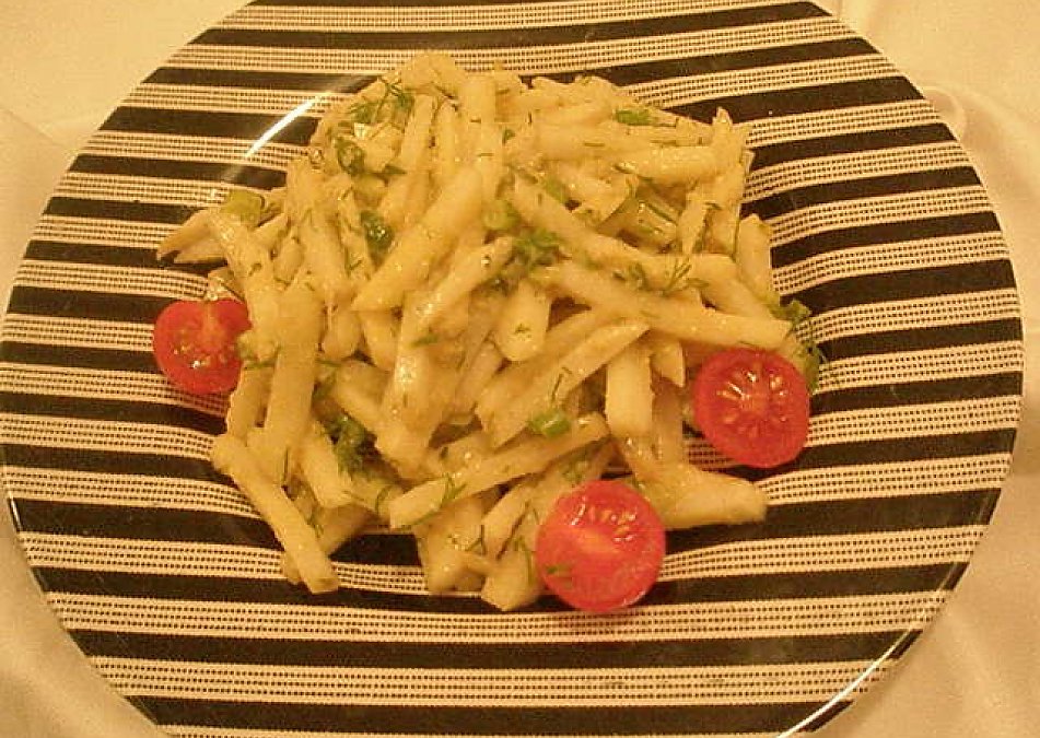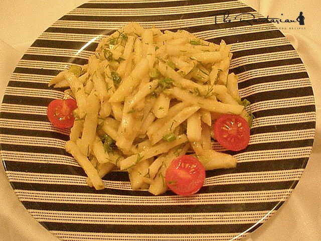 It taste just as spicy radish and can be marinated over night to moderate spice - though I like it as is. In this recipe it very light and refreshing and does satisfies my love for potatoes. This radish used a lot in Asian cuisine. In addition daikon has many health properties.
