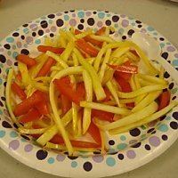 1. cut the tops of the tomatoes, leaving the stalk on the top, and set aside. scoop out the seeds and the flesh of the tomatoes. use the discarded tomato middles in another recipe like gazpacho soup.