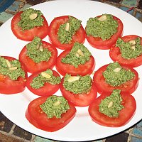 3. stuff the tomatoes with the mixture until they over flow. top with some extra basil leaves, and place the "lids" of the tomatoes back on top. serve with your favorite salad.