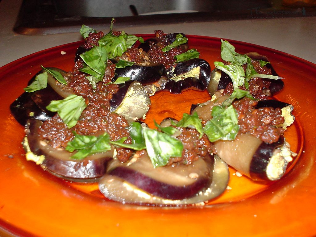 Lightly sprinkle the egglant with salt and allow to marinate overnight. The egglant will wilt and the bitterness will be removed with the salt.