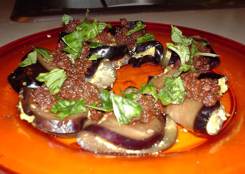 Squeeze out the excess moisture from the egglant and arrange on a plate.