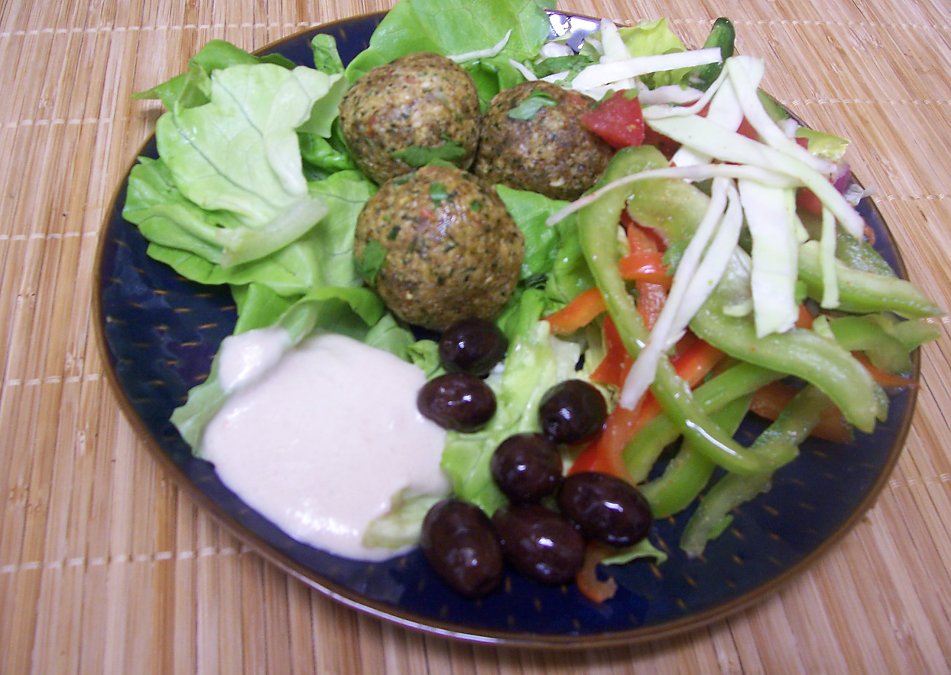 The dehydrator did a fine job of fixing the texture! I made a tzaziki (sp?) sauce, with tahini thinned out with almond milk, dill, finely chopped cucumber and garlic, rolled the falafel in a big romaine leaf with onions and red pepper. YUM!