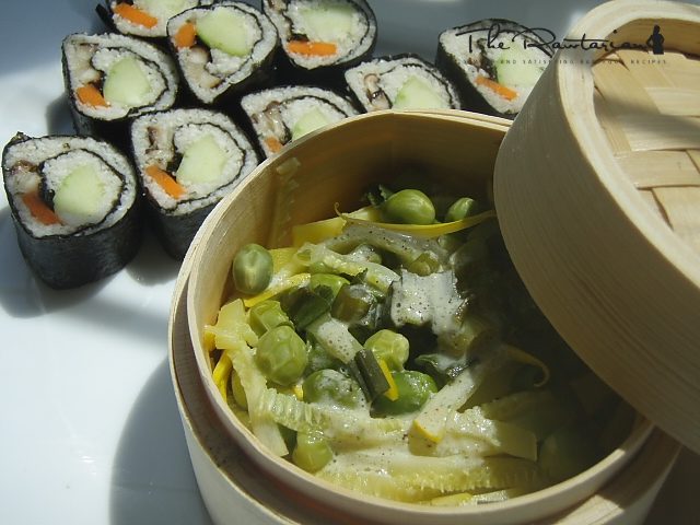 I love having sushi in the "raw". My favorite is futo maki and this is a rendition of the original futo maki that is made with pickled radish, egg or tamago, veggie and rice. At the same time, I wanted to use the fresh peas preshelled from the farmers market. I combined it with the golden zucchini then a touch of...