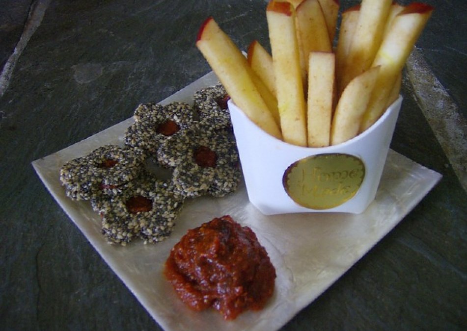 A great sweet ketchup for your fun fruity fries! Of course, you can try other fruit as fries like pear or mango and play around with the jam by mixing other dried fruit with the dates or substitute fresh berries for the dried ones and water. Also pictured as a filling for a variation of my chia sesame crackers. I...