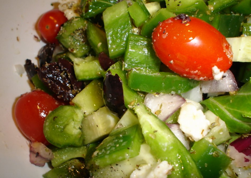 Mix vegetables together. Put ‘feta’ cheese chunks into the salad. Pour the vinegar and olice oil over the salad, then sprinkle on the oregano, salt and pepper. Toss lightly and serve.