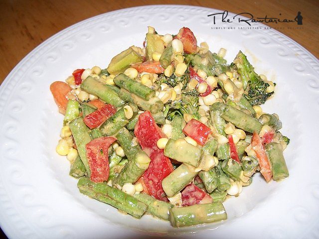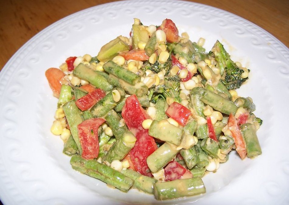 Put chopped green beans, carrots, corn kernals, broccoli florets, peppers, and any other fresh veggie you desire, into a bowl.