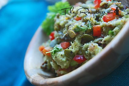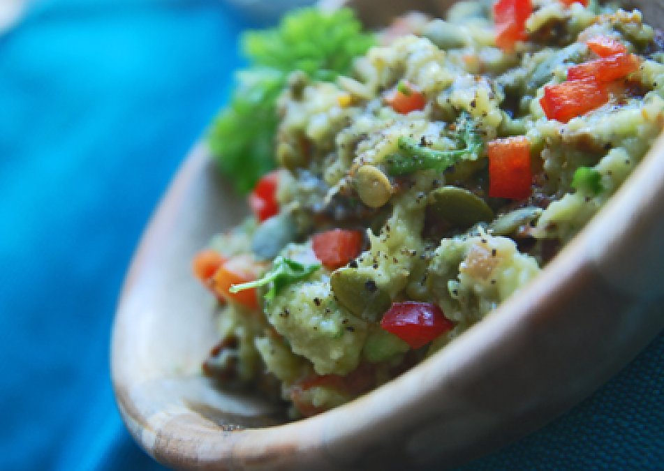 This is a delicious twist on our favorite avocado dip. Divine served in a nori roll with strips of cucumber, carrot, red bell pepper, apple and some green leaves and sprouts e.g. alfalfa or sunflower sprouts. Or, you can serve as a dip with yummy raw veggies. And, of course, you can serve with Mexican food!