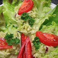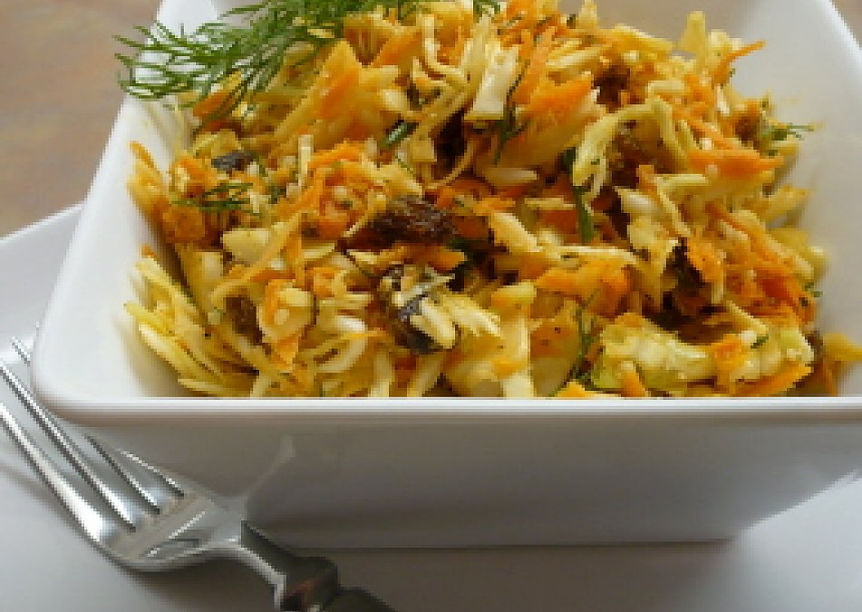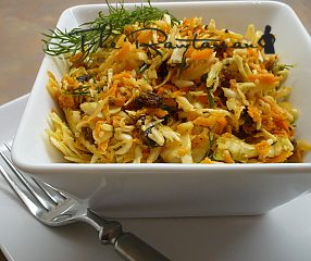 Shred cabbage and carrots in food processor. Add raisins, green onions, dill and hemp seed. Mix together dressing ingredients: avocado, mustard, oil, agave nectar and salt to taste. Toss and enjoy.
