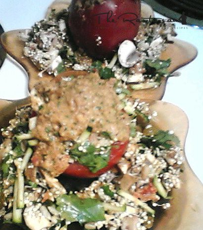 Mix all sauce ingredients together and blend. Don't be shy with the Cilantro!! If you choose to use Ginger either raw or powdered, or Coriander (powdered Cilantro) go easy on THAT! Mix vegetable/grain mixture in bowl or stuff into tomato or mushroom and add more to the sides. Pour sauce over vegetables and grains. Go for it!
