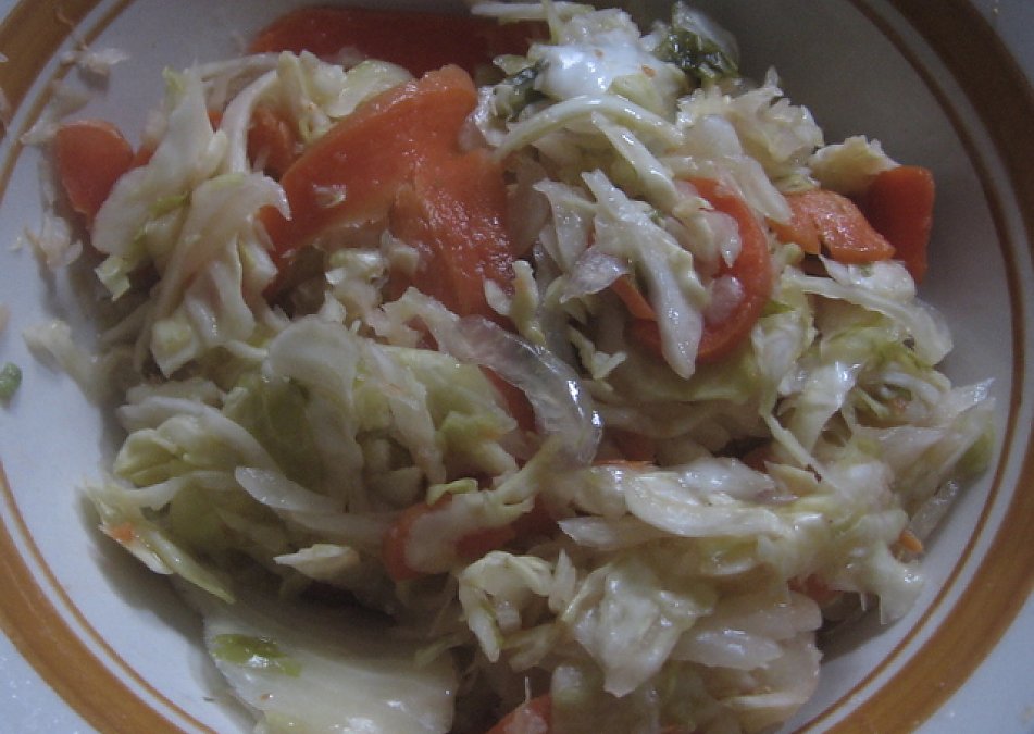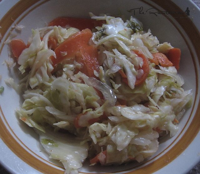Shred the Cabbage, Carrots, and Onion with either a processor or whatever device you have. Place ingrediants in a bowl and pound with a mallet or glass jar until everything is pretty much wilted and you can see a bit of liquid. Store in an air tight container (I used glass, but I think some people use ceramic). Make sure you have something to place on the top of the Kim Chi to weigh the veggies down before you place on the lid. Let sit for about 15 days, you can test it daily to check the progress. Eat it when you feel it tastes right. Also, I mixed mine every few days.