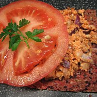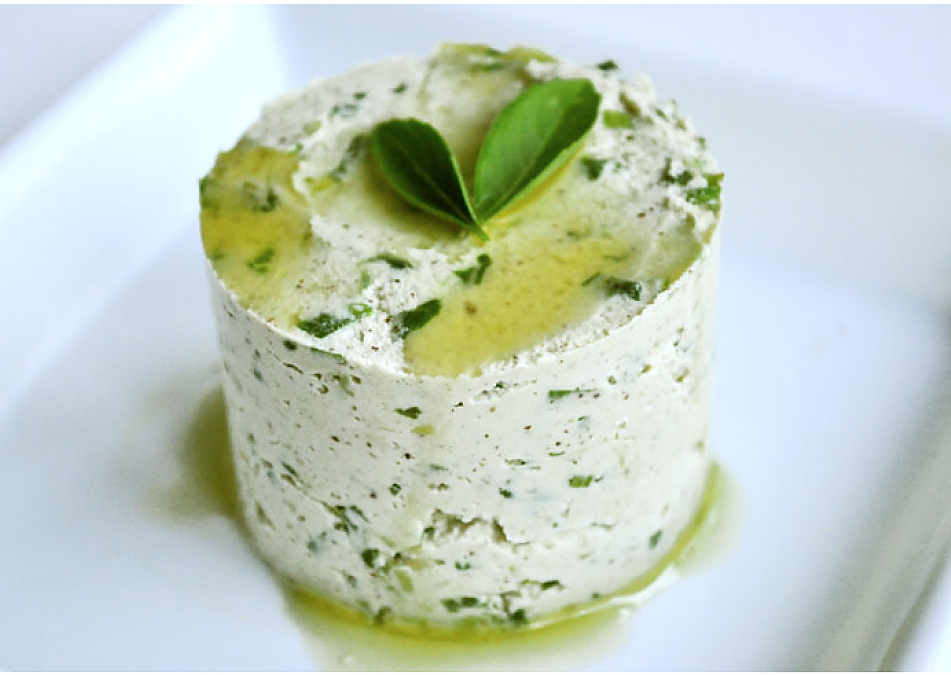 5. To assemble, using a ring mold, scoop mixture into ring and place in freezer for about 10 minutes. Once set, remove ring, drizzle with olive oil and garnish with fresh herbs.