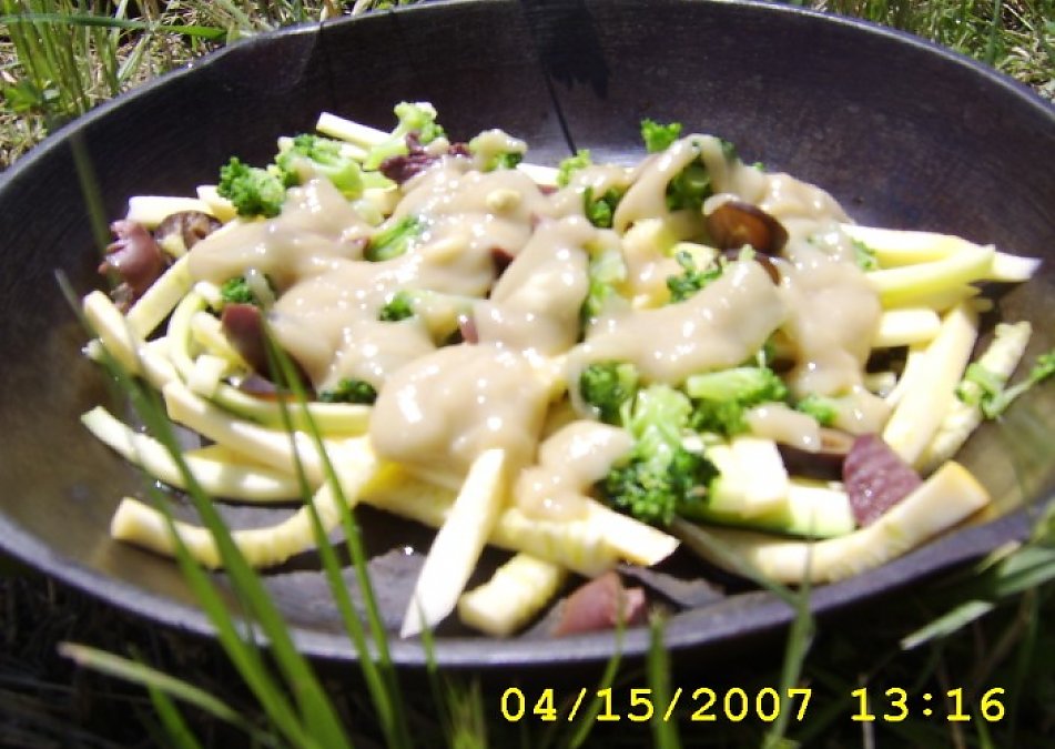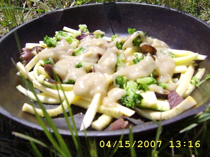 Prepare zucchini and squash to look like pasta (I’d like to get a spirooli, but for now just sliced them). Sprinkle with olives and broccoli. In a cup, mix tahini, garlic, lemon juice and salt. Pour sauce over pasta and enjoy in a warm sunny spot.