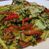 You can Julienne the zucchinis if you have the tools, but I actually don’t. In fact I use a carrot peeler and it makes long, thin noodles that work quite well. Dehydrate the noodles if desired, I don’t own one so I wouldn’t know how long. If you use a carrot peeler to cut them they end up very thin, so I guess they wouldn’t need to dehydrate very long. I eat the noodles raw, I really enjoy them that way.