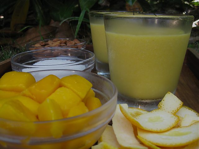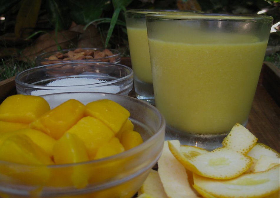 By theblendergirl If you are in search of a taste of the tropics – look no further than this little glass of Heaven. I wanted to call it “Taste of Hawaii” but thought that was a tad corny. But I have let the cat out the bag now, so I suppose I may as well commit! Anyway, just throw everything in the blender and puree until smooth and creamy. I tried this with fresh and frozen mangoes and they both worked “s’blendedly”. I have put the agave nectar and coconut essence as optional extras. You can also substitute vanilla extract. But this smoothie tastes fantastic without the flavor enhancers. But I was in a decadent, celebratory mood and wanted to heighten the nutty flavor and sweetness. Either way – blend up this simple concoction – it is pure bliss.