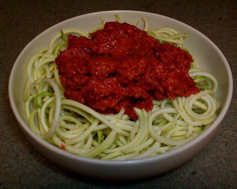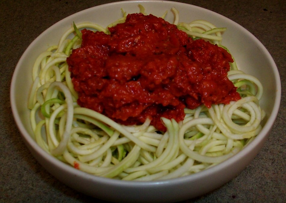 Hi, The sauce looks delish. I made it but juiced some tomato as well to make it a bit runnier rather just adding extra water. Also, I ran across "raw kelp noodles" called Sea Tangle which helps satisfy my craving for a regular noodle and they are of course very healthy for you without the fishy taste/smell.