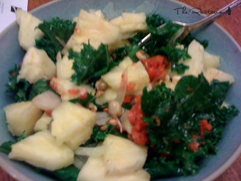 - Pour the 2 TBS of olive oil over Kale and massage into the leaves with your hands for about 2 minutes untill they are tendorized.