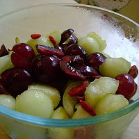 I also like to top this with a cashew cream. I put about .33 cup cashews in a grinder with some fruit and a dash of vanilla. Scoop on top of the melon, and enjoy!