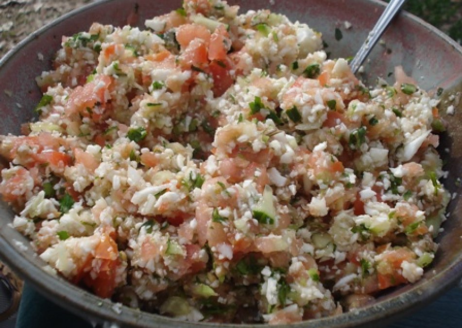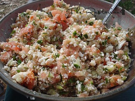I made a simple chopped version of this at work for lunch and it's pretty good! It's a nice summer food, very light and refreshing. I also used orange cauliflower instead of white and it was very colorful.