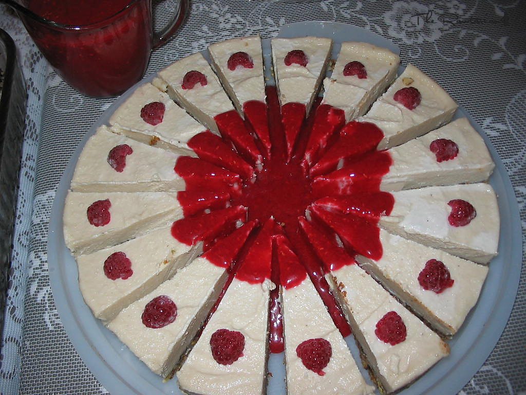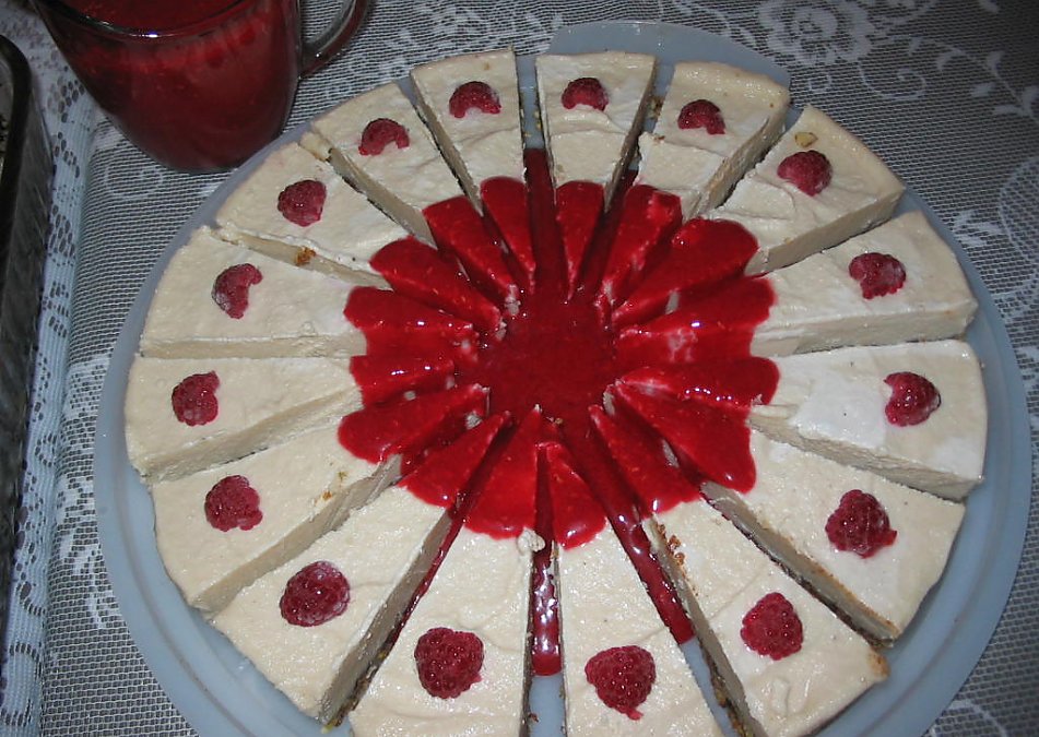 Wow! This is what my husband termed a 'guiltless' dessert for those that don't want to try raw food and want 'good' food. We made it with strawberries instead of raspberries. Was wonderful. I would use less lemon less time and maybe throw in some finely chopped nuts into the crust to make a little crunchier. We also talked about possibly blending some berries into the 'cheese' mixture. Will comment when I do so. Thank you for posting this!