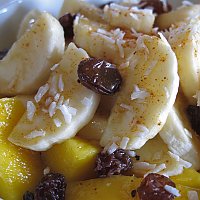 2. Cut fruit and gently combine in serving bowl.