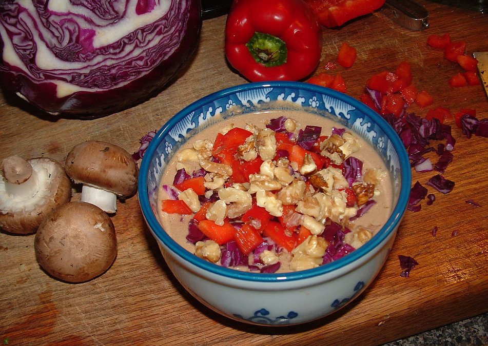 1. Very simple: put everything in blender. I garnished with crushed walnuts, chopped purple cabbage, and chopped red peppers.