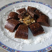 1. In a food processor, blend the nuts and cacao powder until the mixture is well ground.