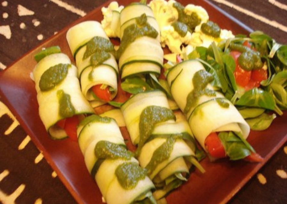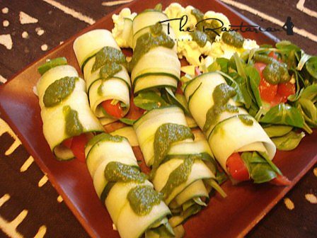 4. Roll the greens and tomatoes up in cucumber wrap.