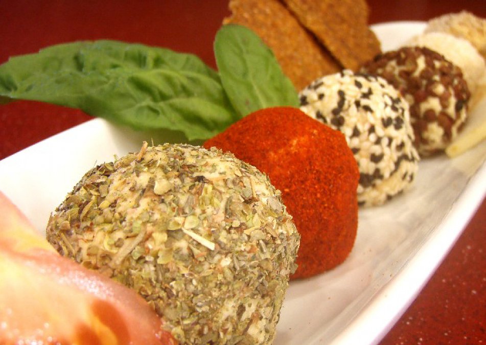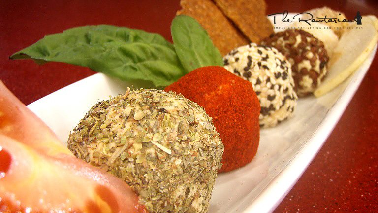 Roll the nut cheese into small balls. I use a tsp to measure the amount for each ball. Coat the nut cheese and serve!