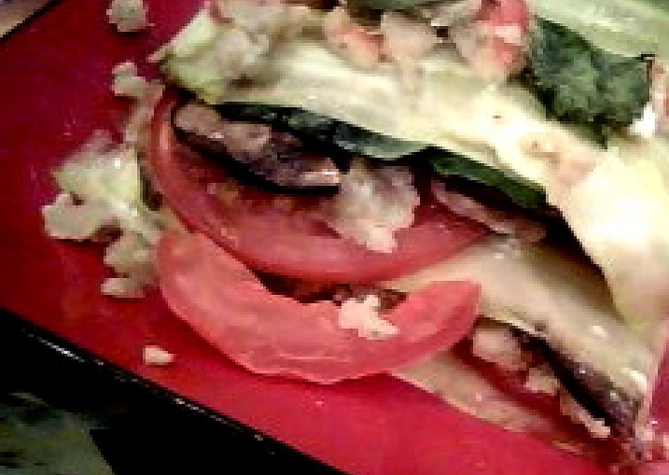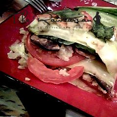 5. Arrange the layers like so: zucchini (slightly overlapping), cheez, tomato slices, mushrooms, spinach, and repeat. Do this so its as tall as you like, and coat the top layer of zucchini with some more cheez and tomato.