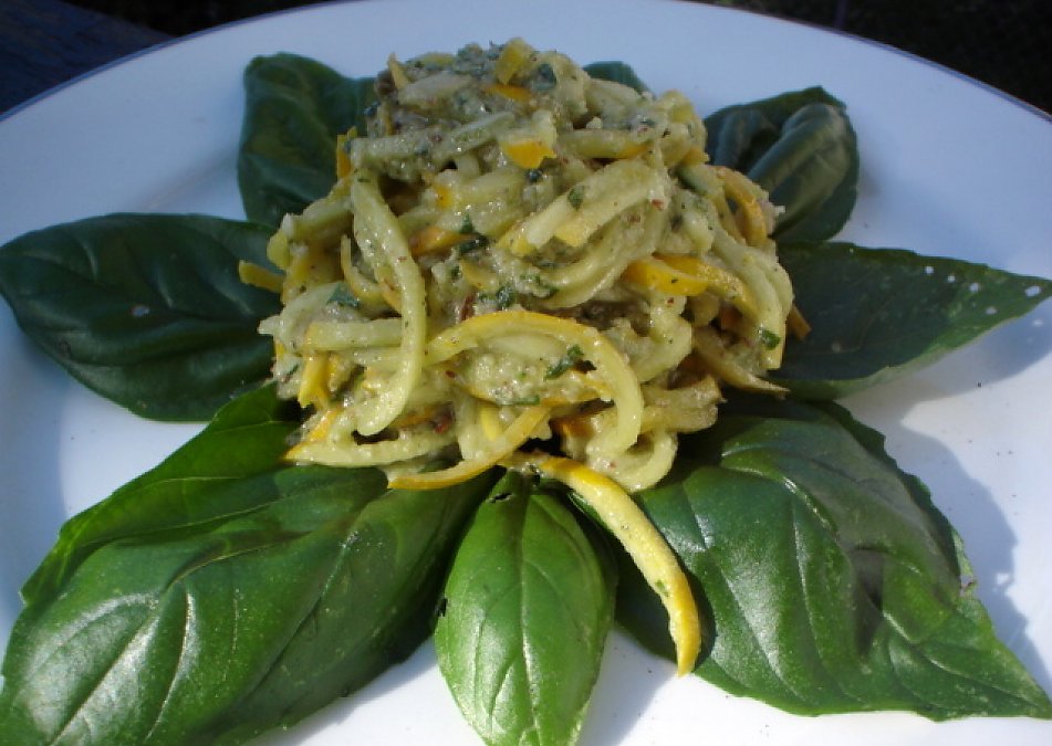 I just ate this last night with zucchini, tomatoes and basil from the garden. i used Alissa Cohen's Basil pesto recipe, which uses 1C walnuts,1/2 C pine nuts, a little olive oil 1/4 C, a clove of garlic, and sea salt along with 2 c of fresh basil leaves. It's amazing and 100% raw.