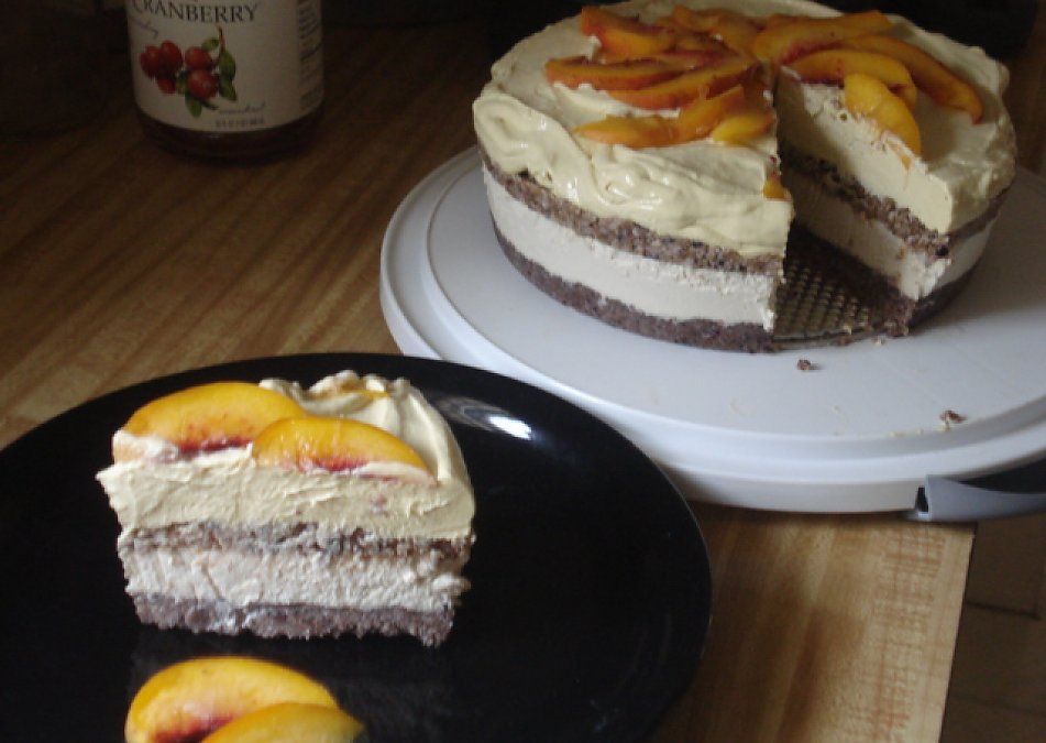 8. Once cream has hardened, press the second half of the crust on top of it and top off with the second half of the peach cream on top of that.
