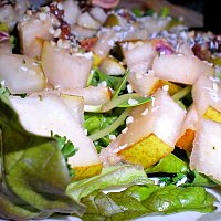 Combine olive oil, lemon juice, ginger, and salt together. Prepare pears, and cabbage. Toss together with almonds, sesame seeds and dressing and enjoy