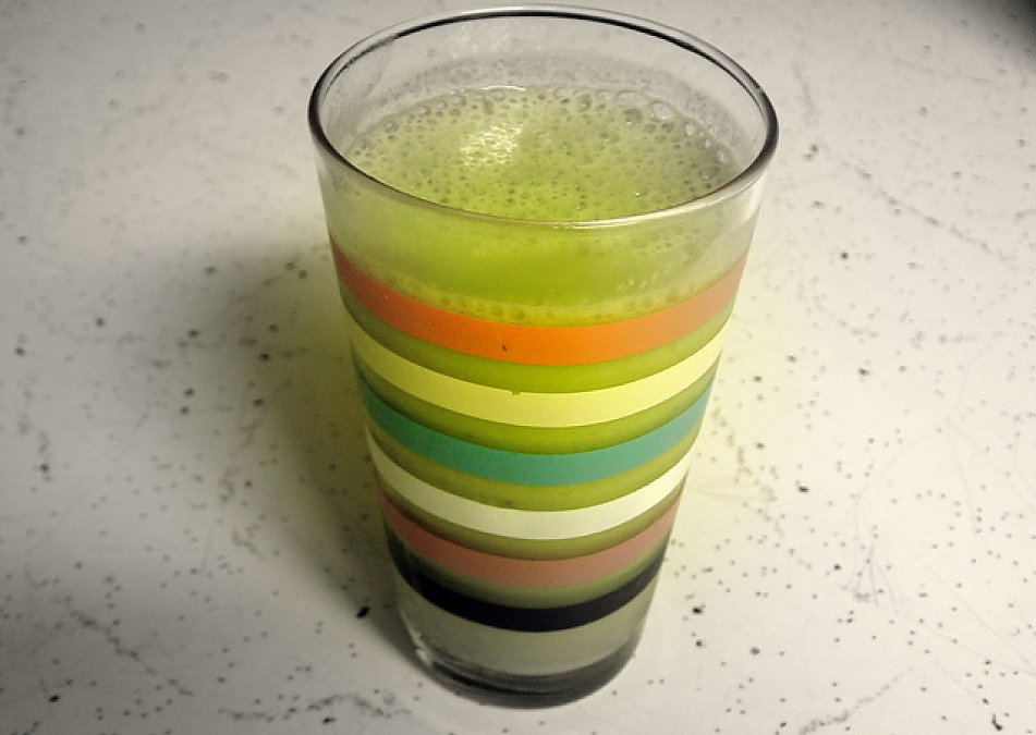 1. Throw collards, fruit, and oil into blender with 1-2 cups water (whatever you need to get it to blend).