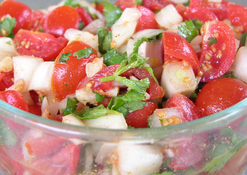 I use red onion because it is sweeter and fresh minced jalapeno or serrano (hot!) chile instead of the dried spices. Then I hit it with a bit of agave nectar which really seems to make it pop!! The little bit of sweet and the hot together are muey bueno!! Add some raw tortillas and ¡Ole!