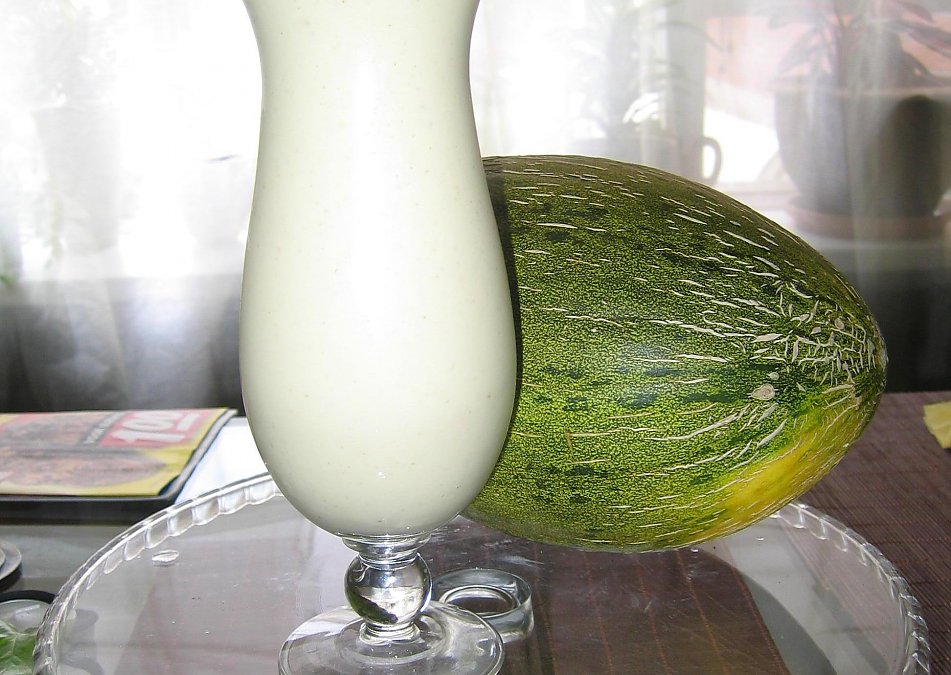 This is a creamy, not shake-like thick, cold milk! Creamy and sweet, with a very light ivory (almost white) color. Piel de Sapo melon comes from Spain, and it is incredibly sweet. See picture for the melon and shake.