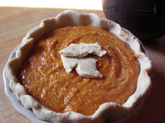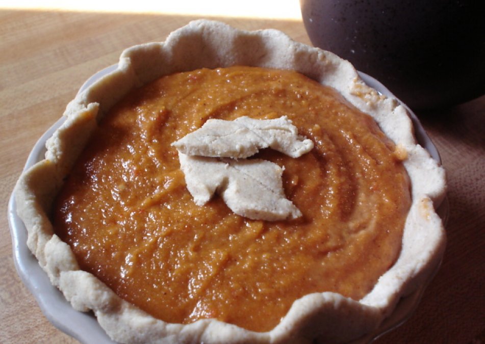 By poemomm This pie was created to replicate the taste and mouth feel of the traditional recipe on the back of the Libby’s Pumpkin can. Macadamia nuts substitute for cream, while carrots hide in place of pumpkin.