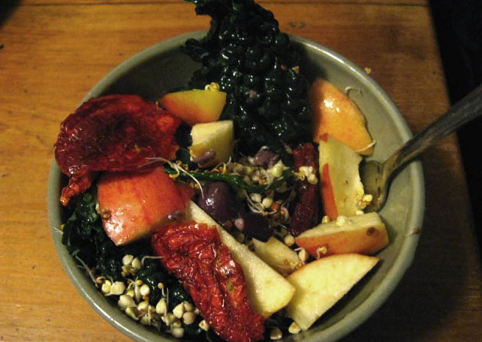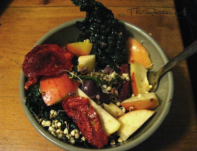 I used black kale for this recipe but any kind will do. Break or chop up the kale. Pit the olives and break them up and rub them into the kale. The kale will end up coated in olive bits and absorb the flavour. Chop apple into pieces and add. Add sun dried tomatos. Sprinkle sprouts over top.(I used some buckwheat spourts and assorted salad sprouts.) Eat!