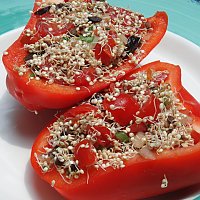 Refreshing! Looking into my mother’s fridge yesterday, I found a little store-bought container of tabouleh. I looked at the ingredient list and replicated the recipe, tasting to find good proportions, and substituting quinoa sprouts for the cooked buckwheat traditionally used in tabouleh. Do make sure you wash the mint especially throroughly, and only use the leaves, as it has little hairs on it that can irritate one’s mouth. The ingredient list indicated that alspice is usually used, but since I didn’t have any non-irradiated alspice on hand, I didn’t include this in my version. I do encourage you to try it with alspice and let me know how it goes!