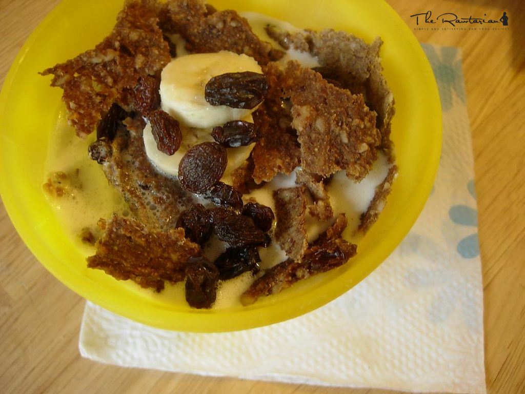 2. Stir in raisins. If you want bread, spread on a Teflex sheet about 1/2 inch thick and dehydrate about 10 to 12 hours flipping half way through until still soft yet firm.