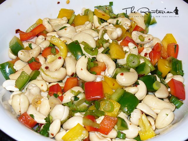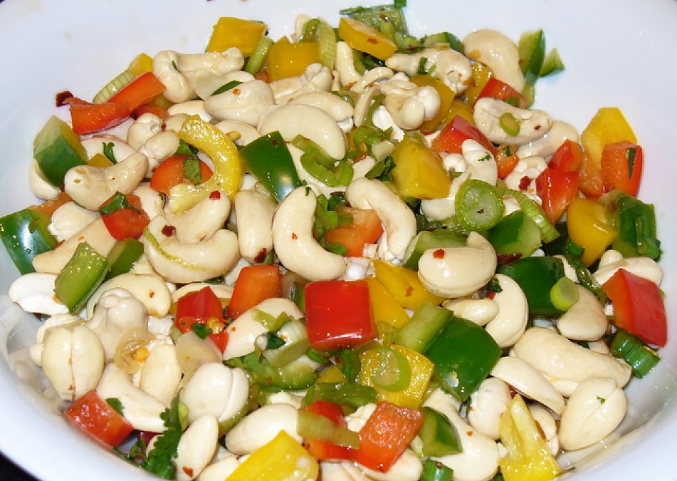 Soak cashews six hours or overnight, then rinse and drain. Add chopped red, yellow and green peppers, green onions and either dried or chopped fresh chili pepper (without the seeds for a milder salad to taste). Finish with fresh squeezed lime juice, Braggs Aminos (or Shoyu) and chopped fresh cilantro.
