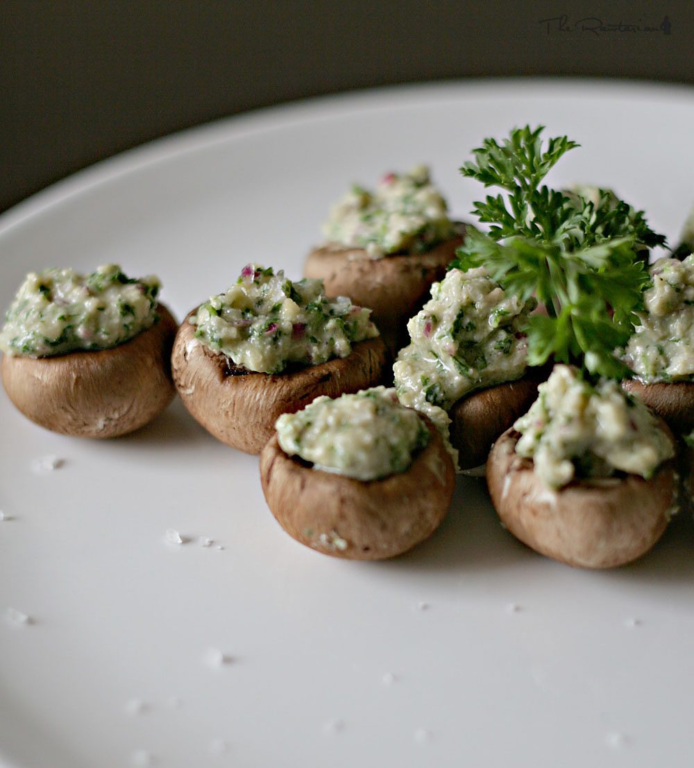 Process all ingredients except mushrooms in a food processor until combined. I like to leave my filling chunky, so I only processed for about 30 seconds, scraped the bowl and processed another 10 seconds. You may add some water if the filling isn’t combining properly. Spoon a little bit into each mushroom. Garnish with parsley and sea salt, if desired. :)