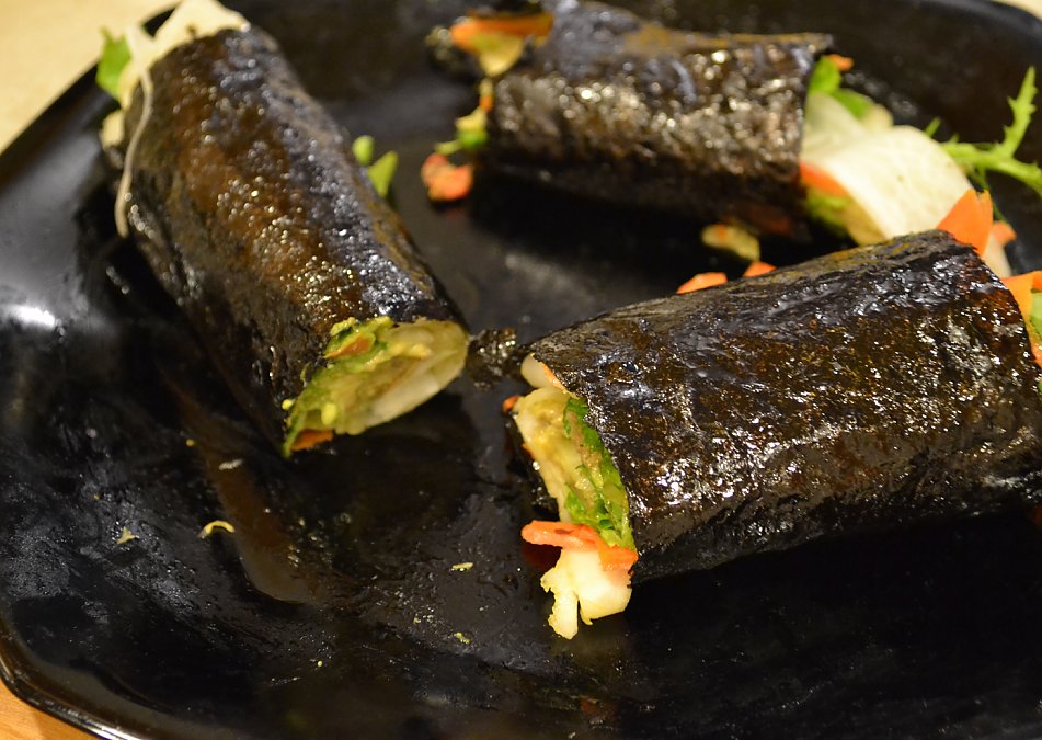 Lay out on a flat surface, a sheet of nori. Spread on half of it some almond butter, a bit of ginger, some wasabi, a squeeze of lemon, and some hemp oil(or instead of all that a favorite dip/dressing/sauce).