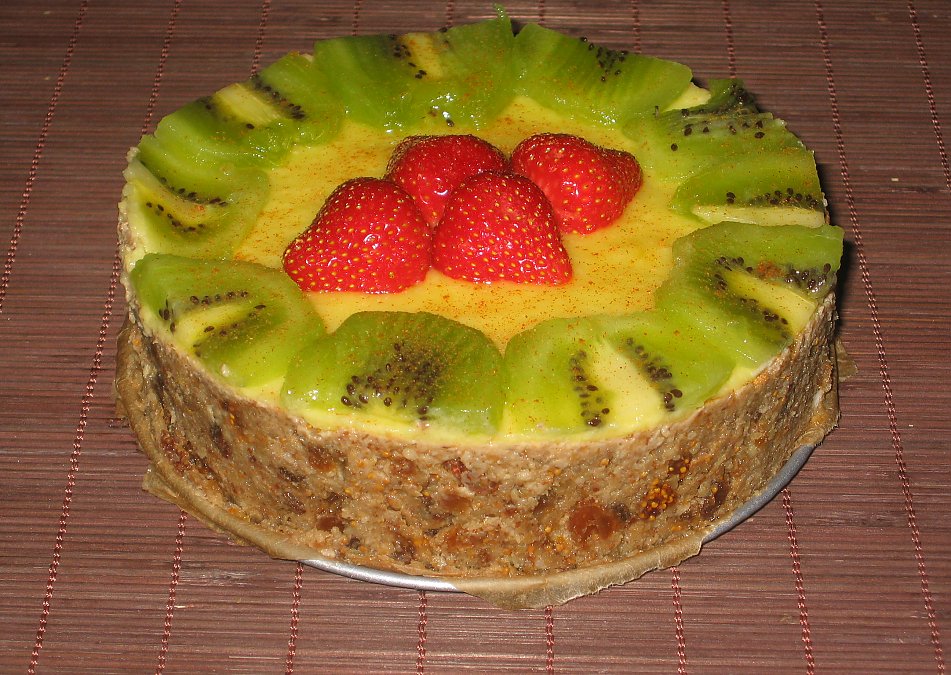 justbeautiful: Good idea! After you have blended all ingredients, you could add shunks of the papaya to the mix. This would look beautifull as well. The only think I am thinking is this. The papaya layered on the crust, between the crust and the filling, sicks the cust and the filling together. So, if do not include the papaya, which has to be very ripe in order to hold together the crust and the filling so it pie piece holds together instead of ending in two lossely layers, I think the filling will not hold together, once is set, to the crust. In another recipe from The American Vegetarian Cook Book, they use bananas as a layer, very ripe bananas which are good and very sticky. As for the measurments of the crust ingredients, you could use all of them, then use what you need for the pie crust and put the rest in the freezer, defrost later and use it for the balls or another pie crust. I would cut the recipe of the balls half and post it later. ok?